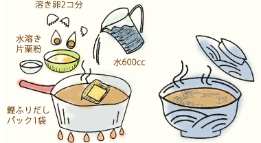 - 1.水600ccに鰹ふりだし1袋を入れ「だし」をとります。