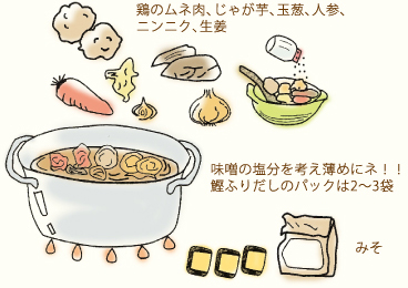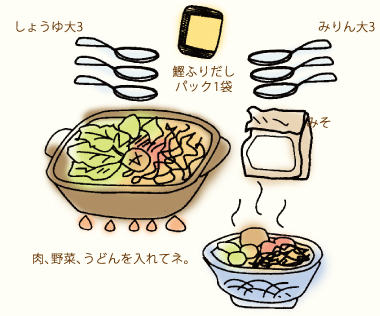 - 2.味噌で味を整え、肉、野菜、うどんを入れ火を通すとでき上がり。