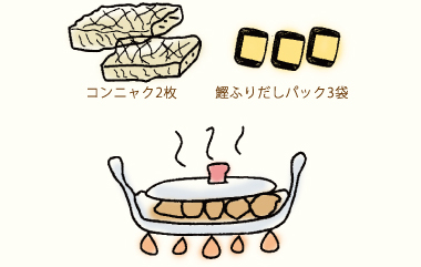 - 3.コンニャク2枚に対し、鰹ふりだしのパック3袋を入れ、